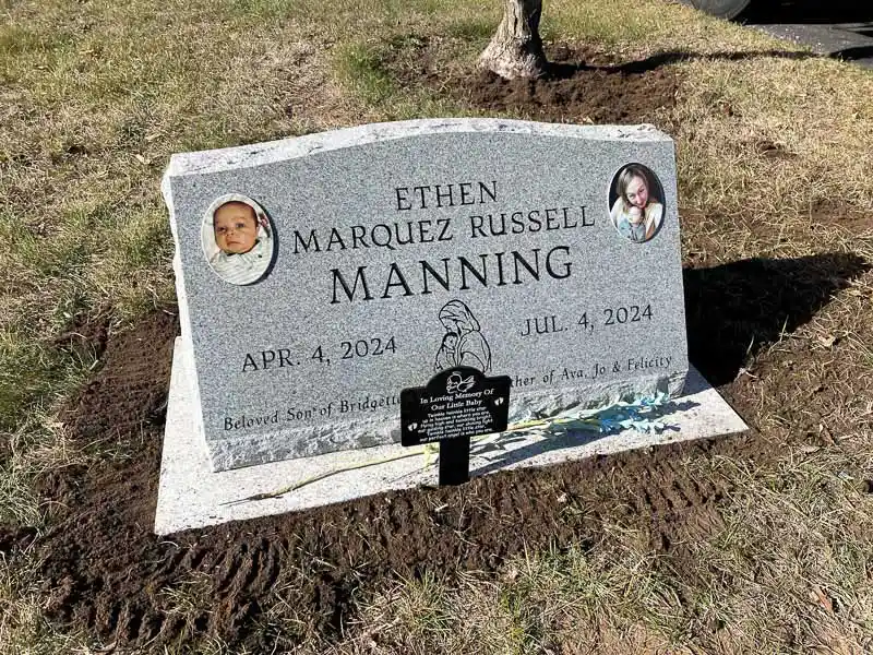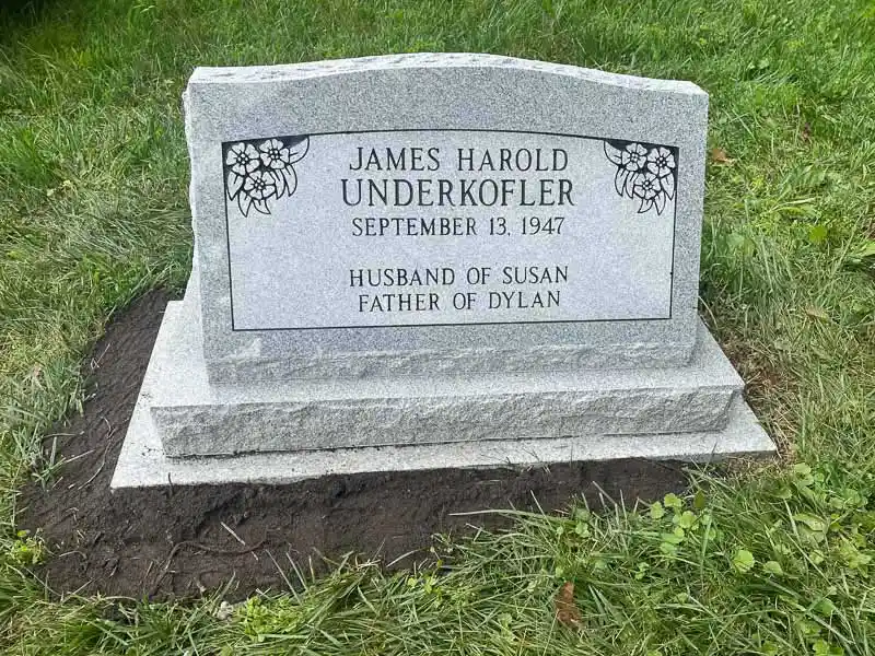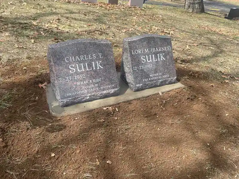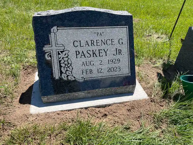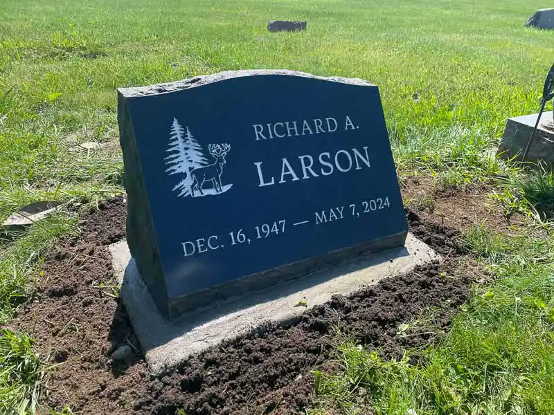 The advantage of a slanted grave marker, as opposed to a lawn-level or bevel grave marker, is that it is easily visible from a distance. While not tall enough to be considered an upright monument, a slanted gravestone still stands out in a cemetery because the granite is cut to sit at a steep angle. It can be placed on a solid granite base or be designed to sit directly on the ground.